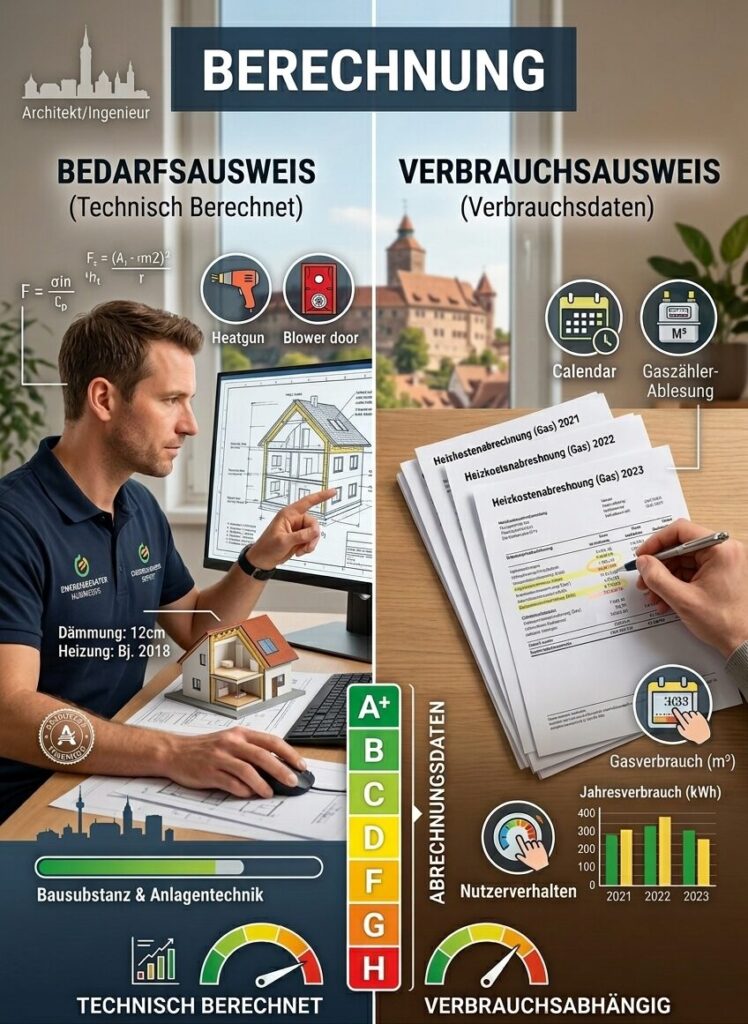 Bedarfsausweis: Ein Energieberater oder Architekt berechnet den Energiebedarf anhand der technischen Daten der Gebäudehülle und der Heizung.